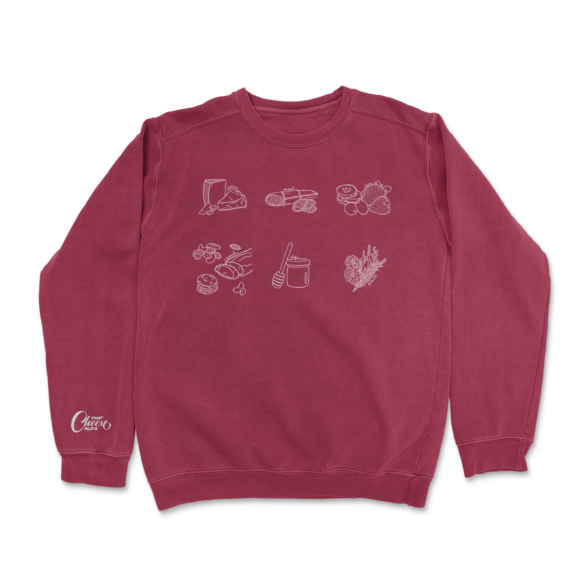 Introducing That Crew Neck, Cheese By Numbers edition! With six hand-drawn illustrations, the sweatshirt showcases each step of the popular "Cheese By Numbers" method: cheese, meat, produce, crunch, dip, and garnish. Show your love for cheese plates in a hip and stylish all year round!